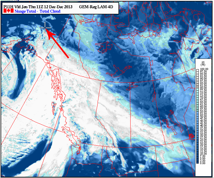 (箭頭所指十字處為Fairbanks,剛好閃過這一大片雲)