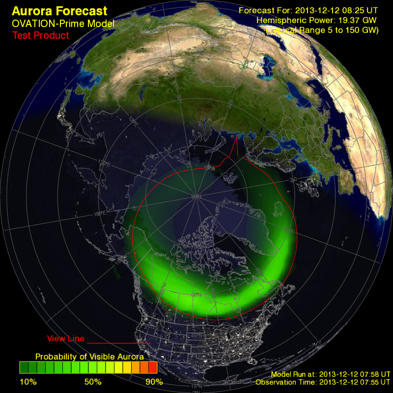 非常好用的極光能見率預測圖,注意他的顏色是「可見機率」與可見範圍分布,並非「就是」極光。