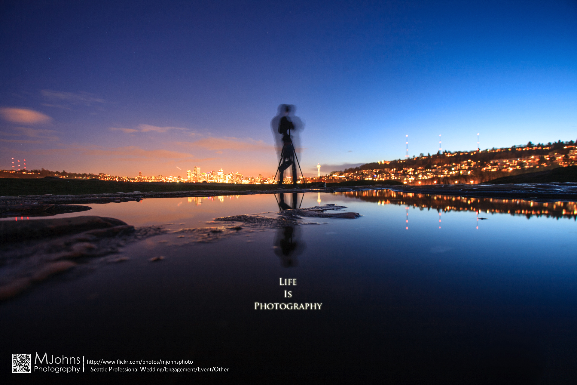 在Gasworks Park的山丘上,利用雨後的積水低角度拍攝出西雅圖天際線的倒影