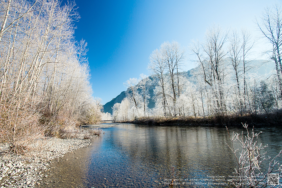 利用早晨的光線與清新空氣,在樹上掛霜尚未溶解時於溪邊拍攝。
