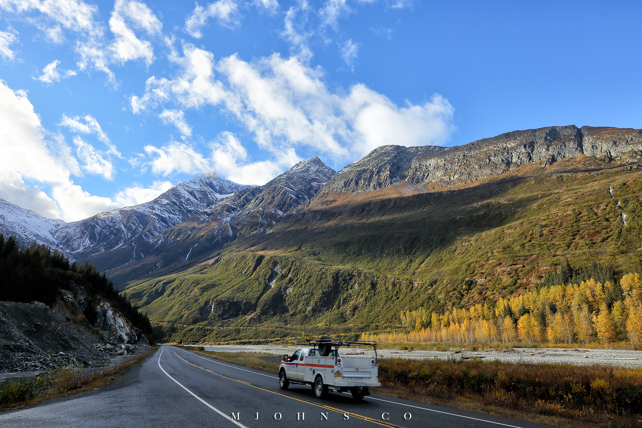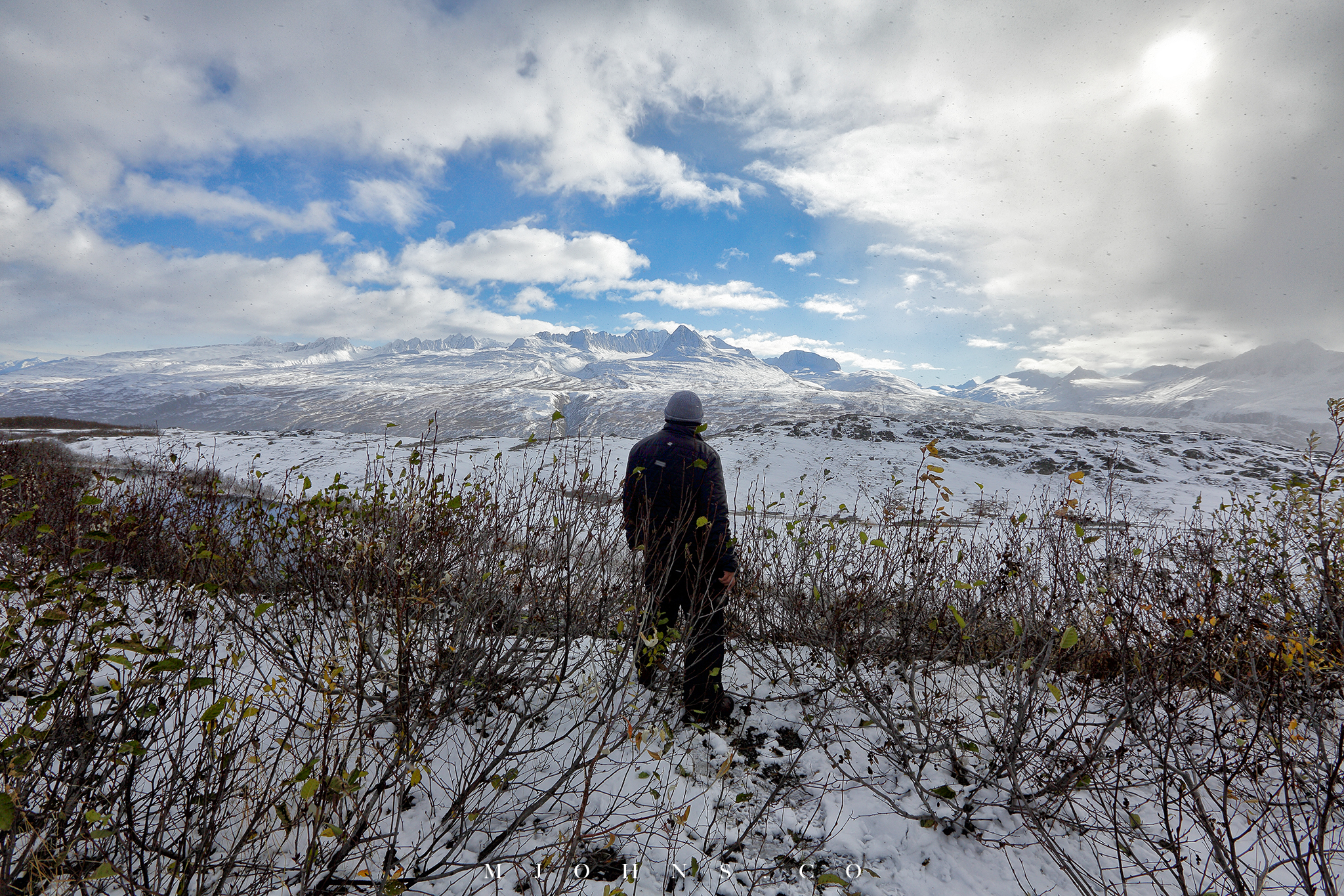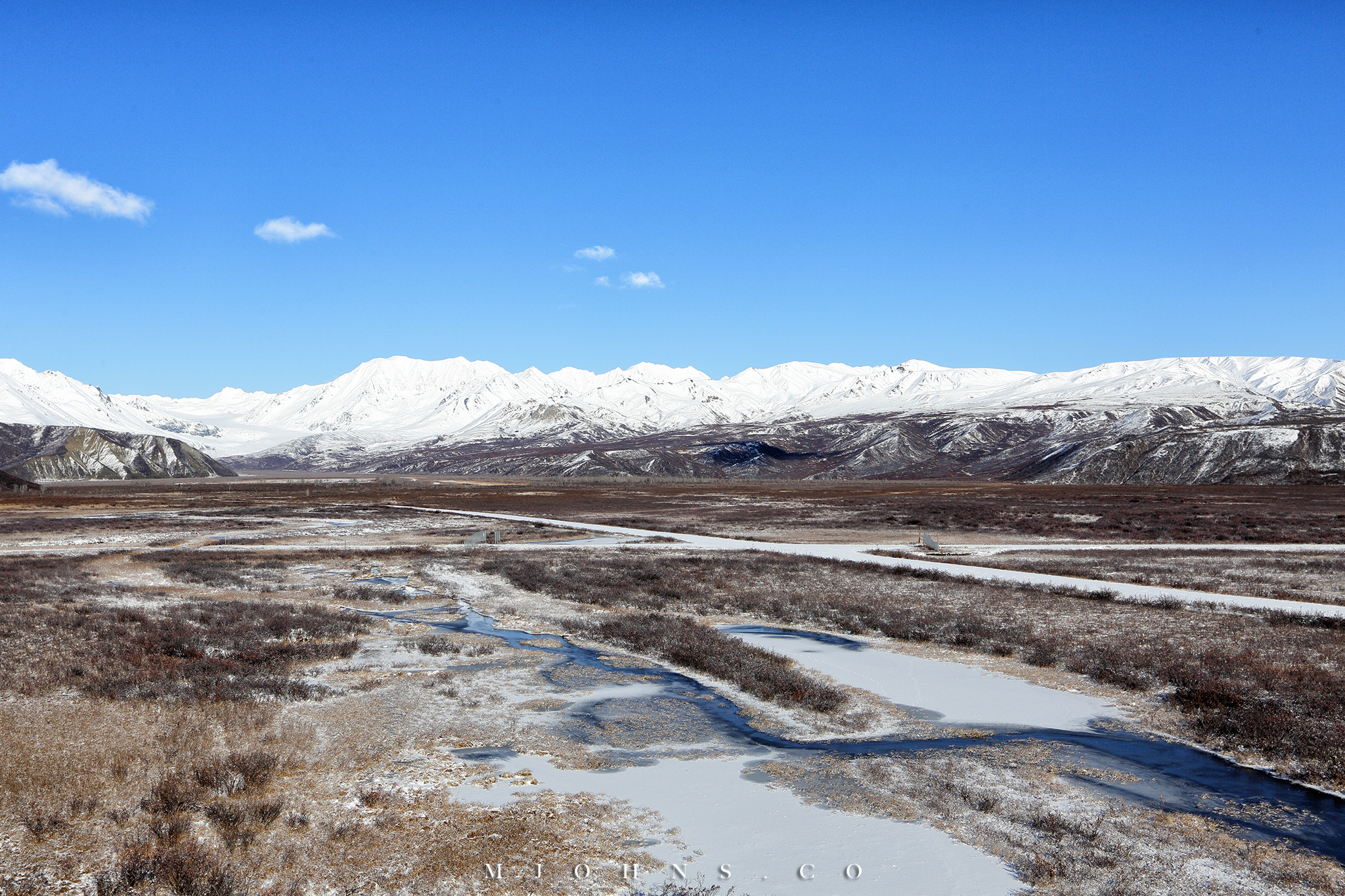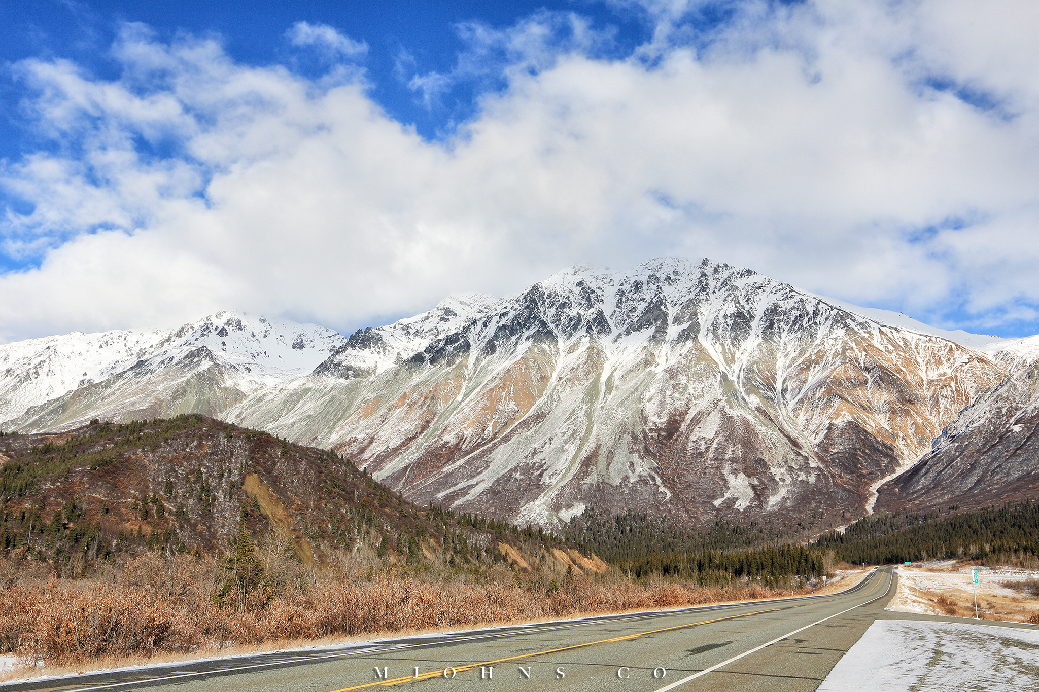 夜晚風塵僕僕來到Copper center,住在一間不錯的B&B,以這裡為基地隔天繼續南下。所幸這一帶風雪漸停,天亮再次出發時更是多雲到晴的天氣,路上也沒有積雪,才讓第二段車程順利了不少。雖然沒有像Christopher一樣走進荒野的霸氣,我們能用自駕的方式快速的走過這片無垠大地,路途中每一段路都有讓人想駐足許久的地方,每過一個彎道看見不同的景色都讓人驚喜連連。