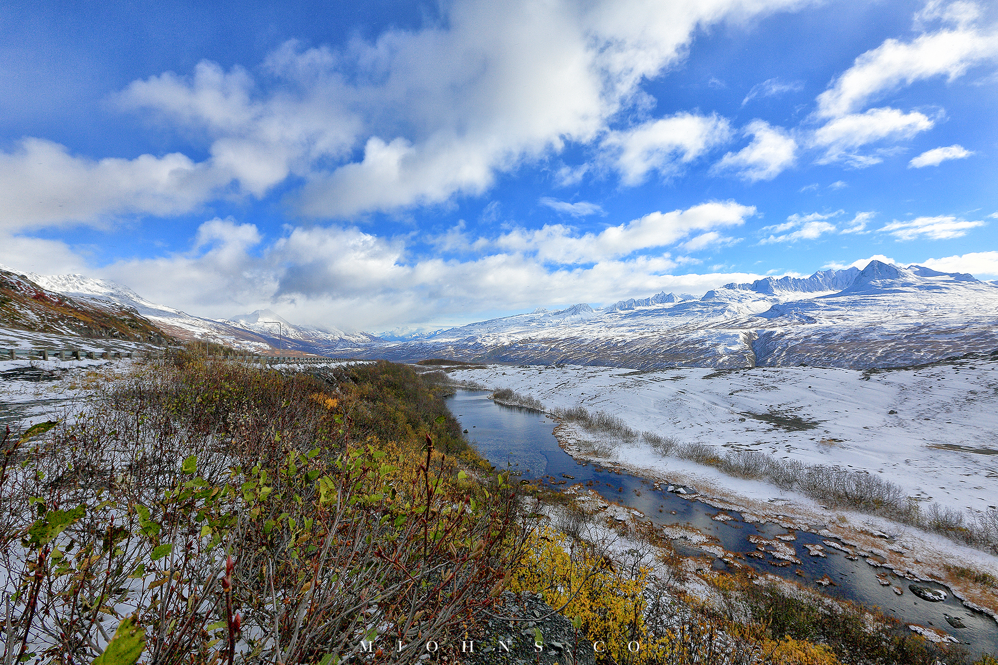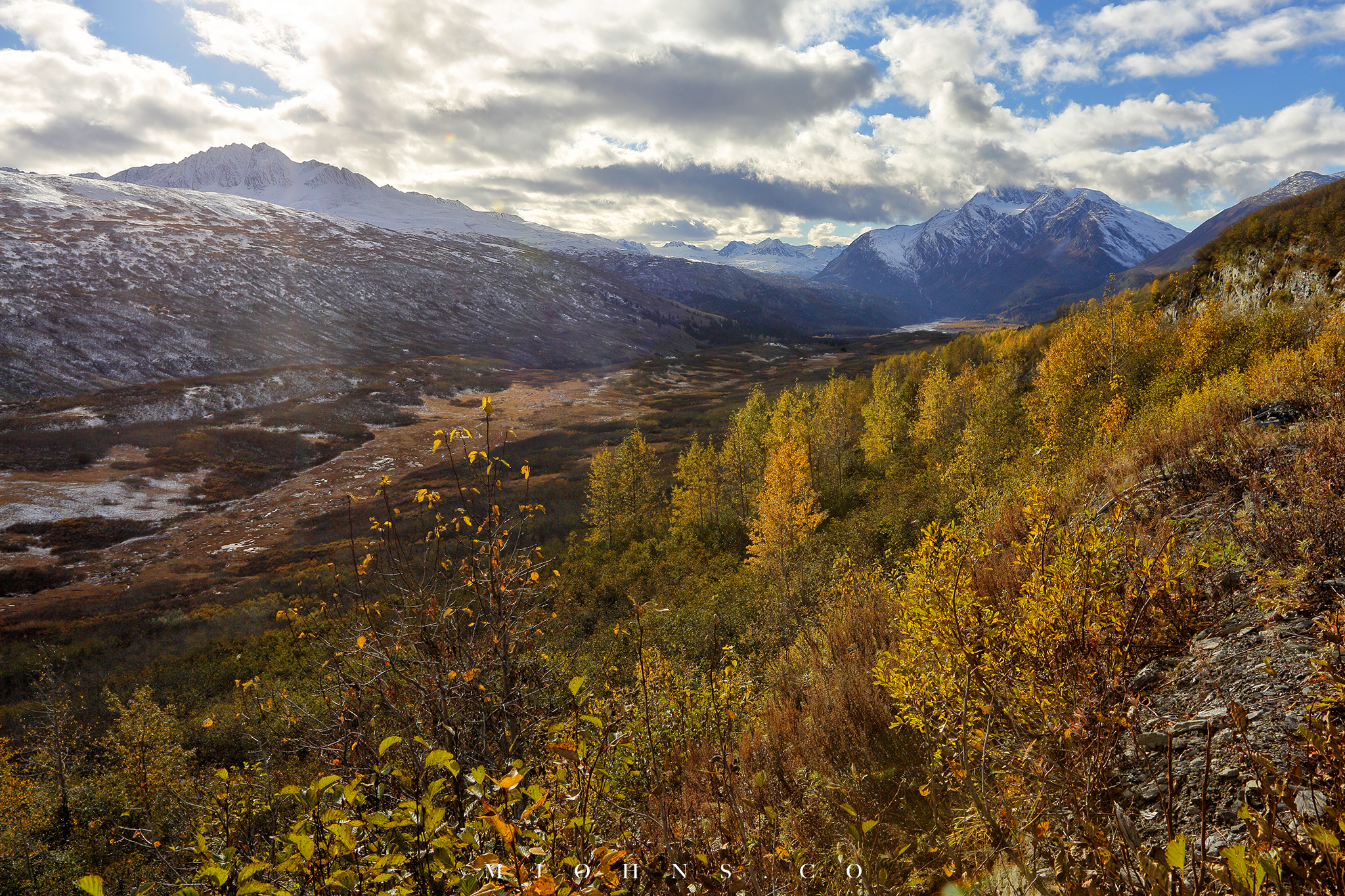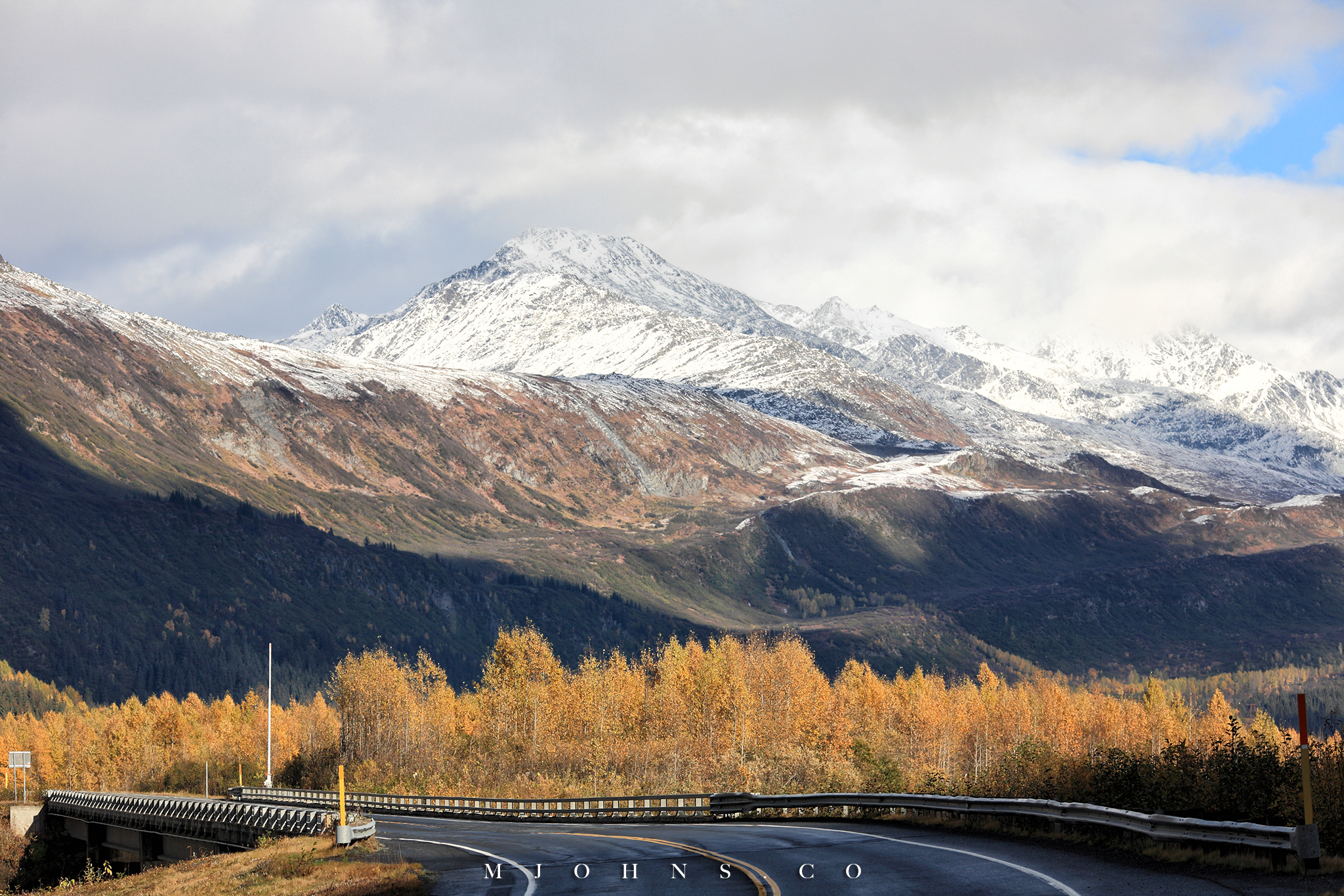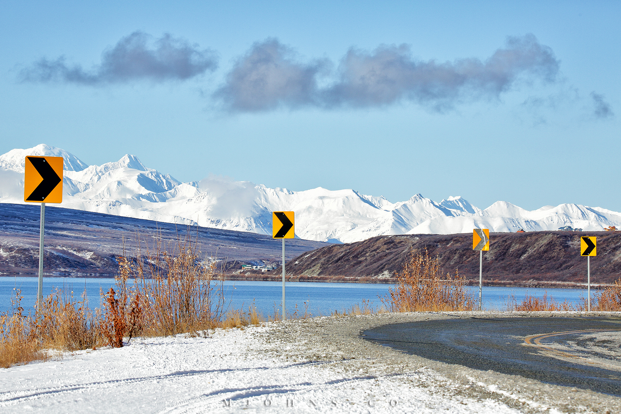 夜晚風塵僕僕來到Copper center,住在一間不錯的B&B,以這裡為基地隔天繼續南下。所幸這一帶風雪漸停,天亮再次出發時更是多雲到晴的天氣,路上也沒有積雪,才讓第二段車程順利了不少。雖然沒有像Christopher一樣走進荒野的霸氣,我們能用自駕的方式快速的走過這片無垠大地,路途中每一段路都有讓人想駐足許久的地方,每過一個彎道看見不同的景色都讓人驚喜連連。