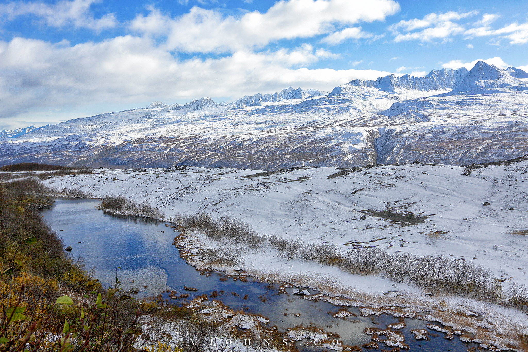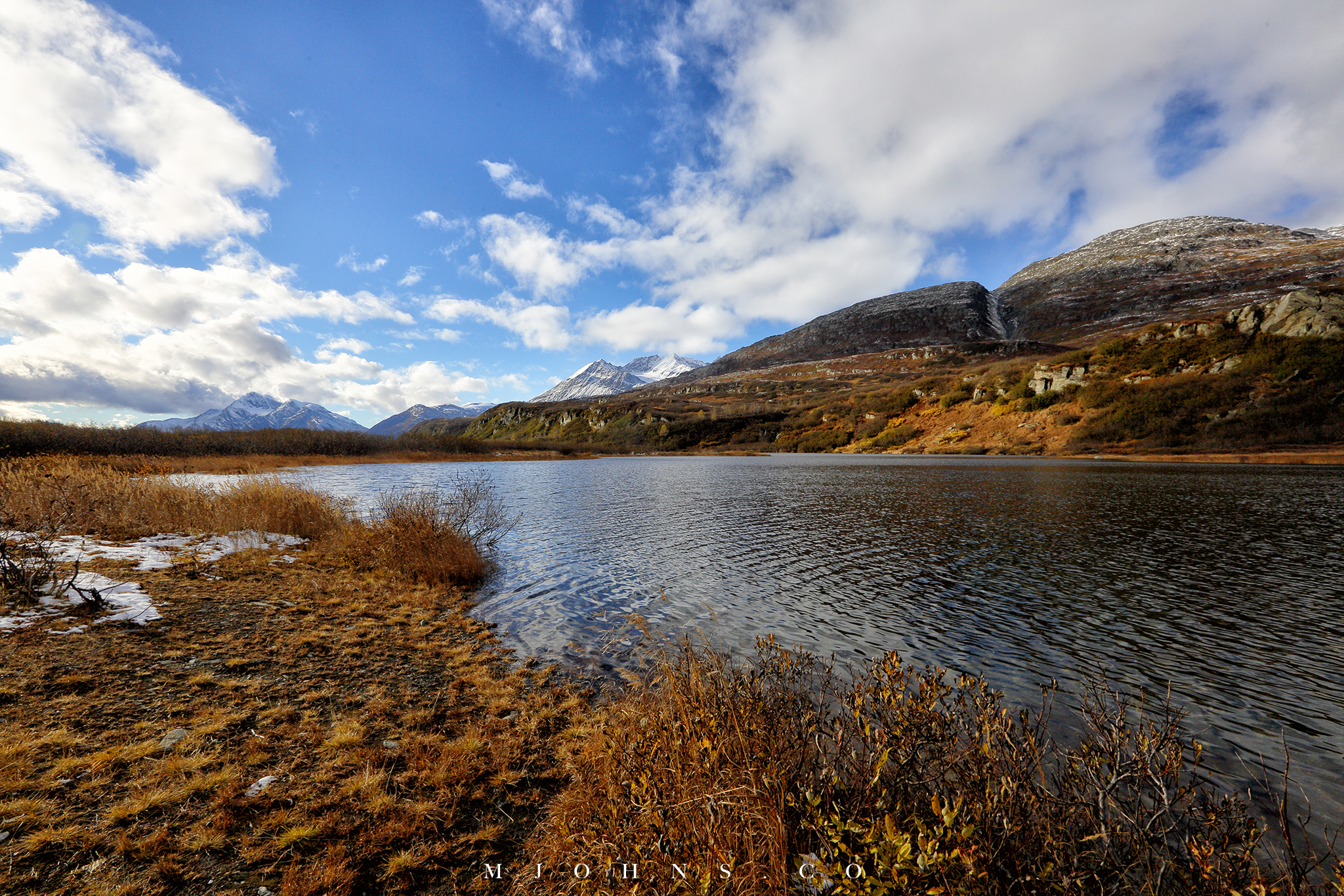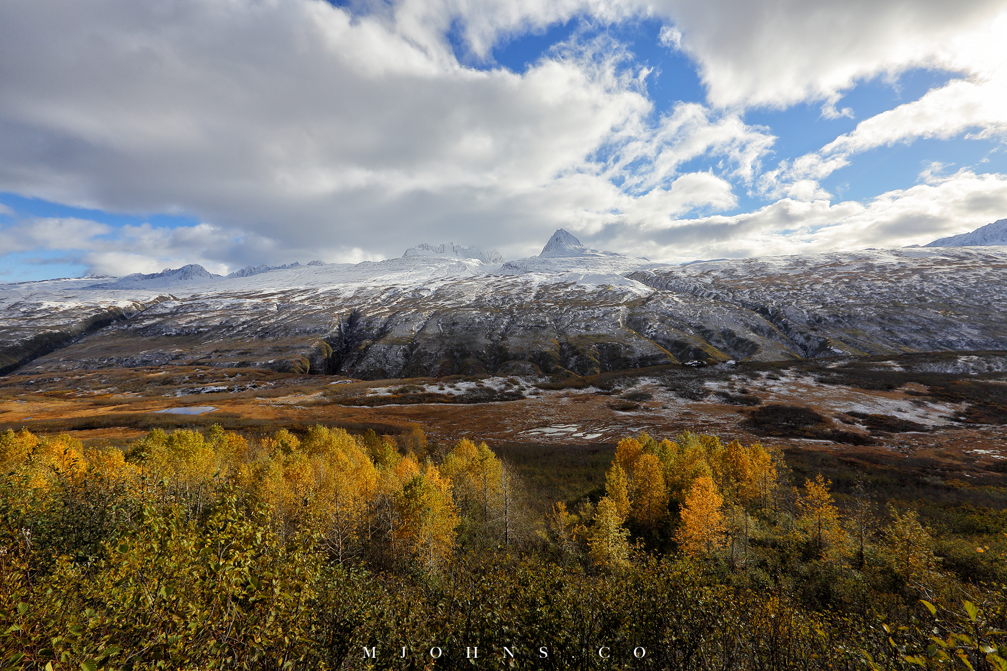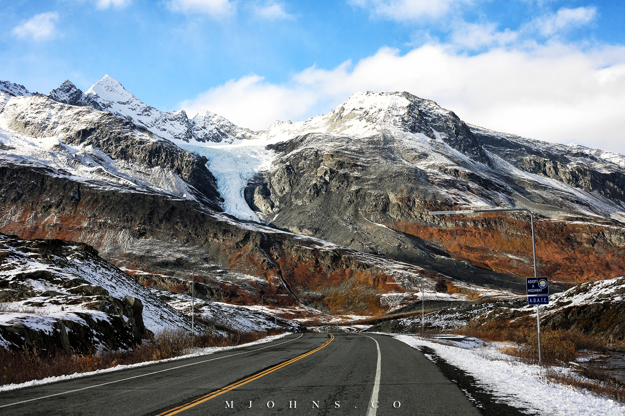 夜晚風塵僕僕來到Copper center,住在一間不錯的B&B,以這裡為基地隔天繼續南下。所幸這一帶風雪漸停,天亮再次出發時更是多雲到晴的天氣,路上也沒有積雪,才讓第二段車程順利了不少。雖然沒有像Christopher一樣走進荒野的霸氣,我們能用自駕的方式快速的走過這片無垠大地,路途中每一段路都有讓人想駐足許久的地方,每過一個彎道看見不同的景色都讓人驚喜連連。