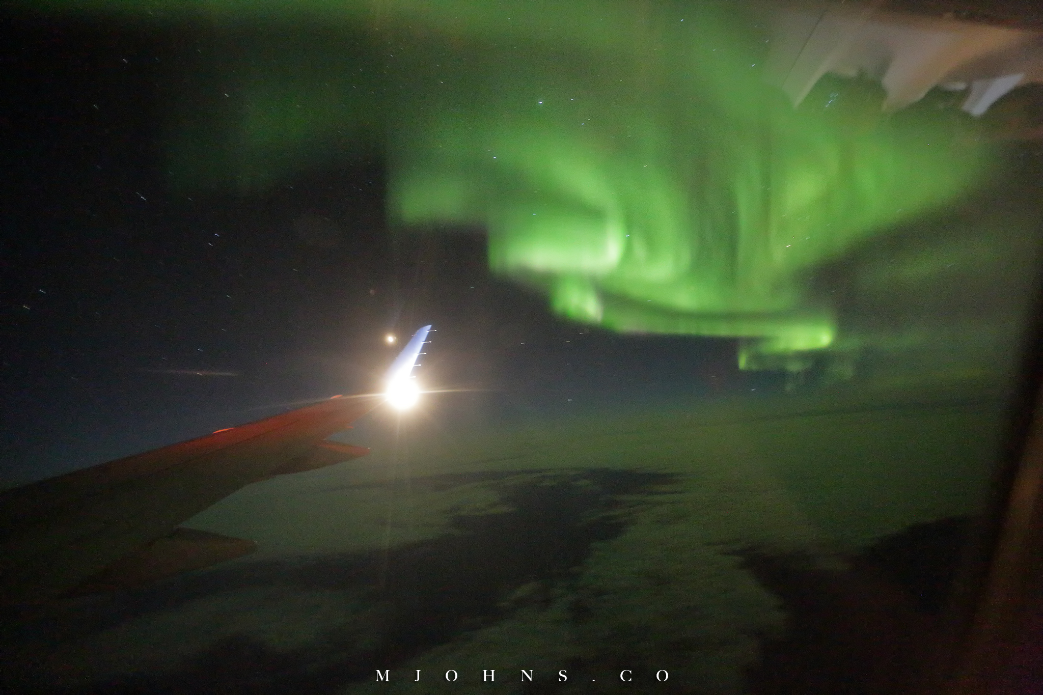 ▲在飛機上就幸運的遇見極光爆發,不過這次碰上亂流多增加拍攝困難度,然後Delta的窗戶實在很髒啊Orz。