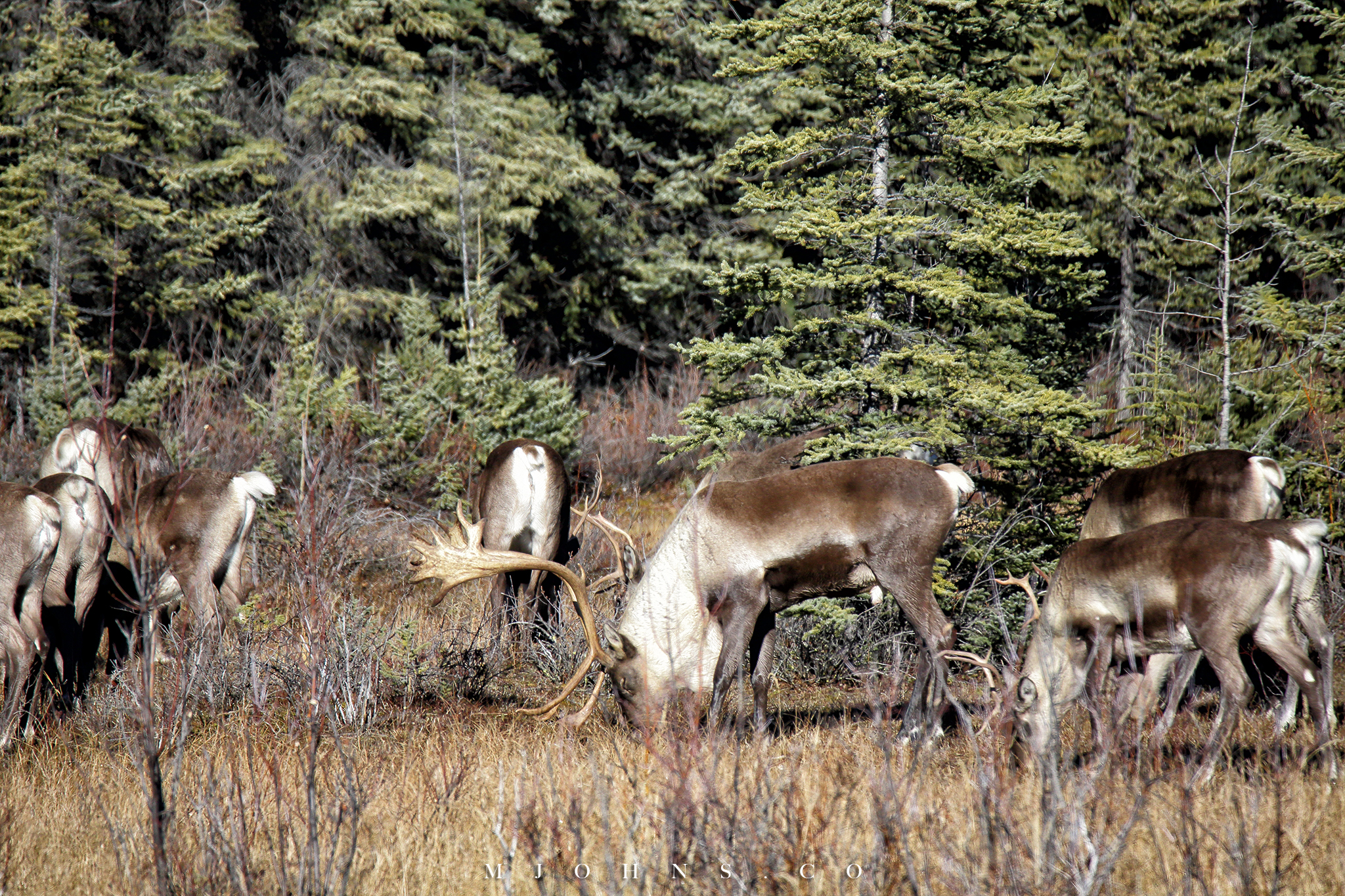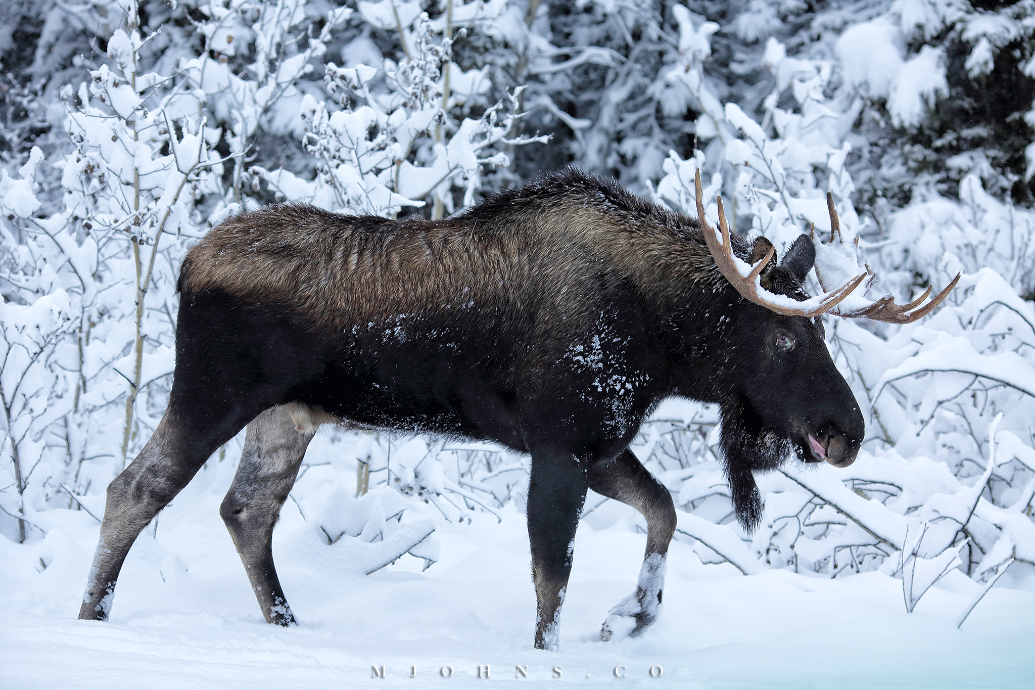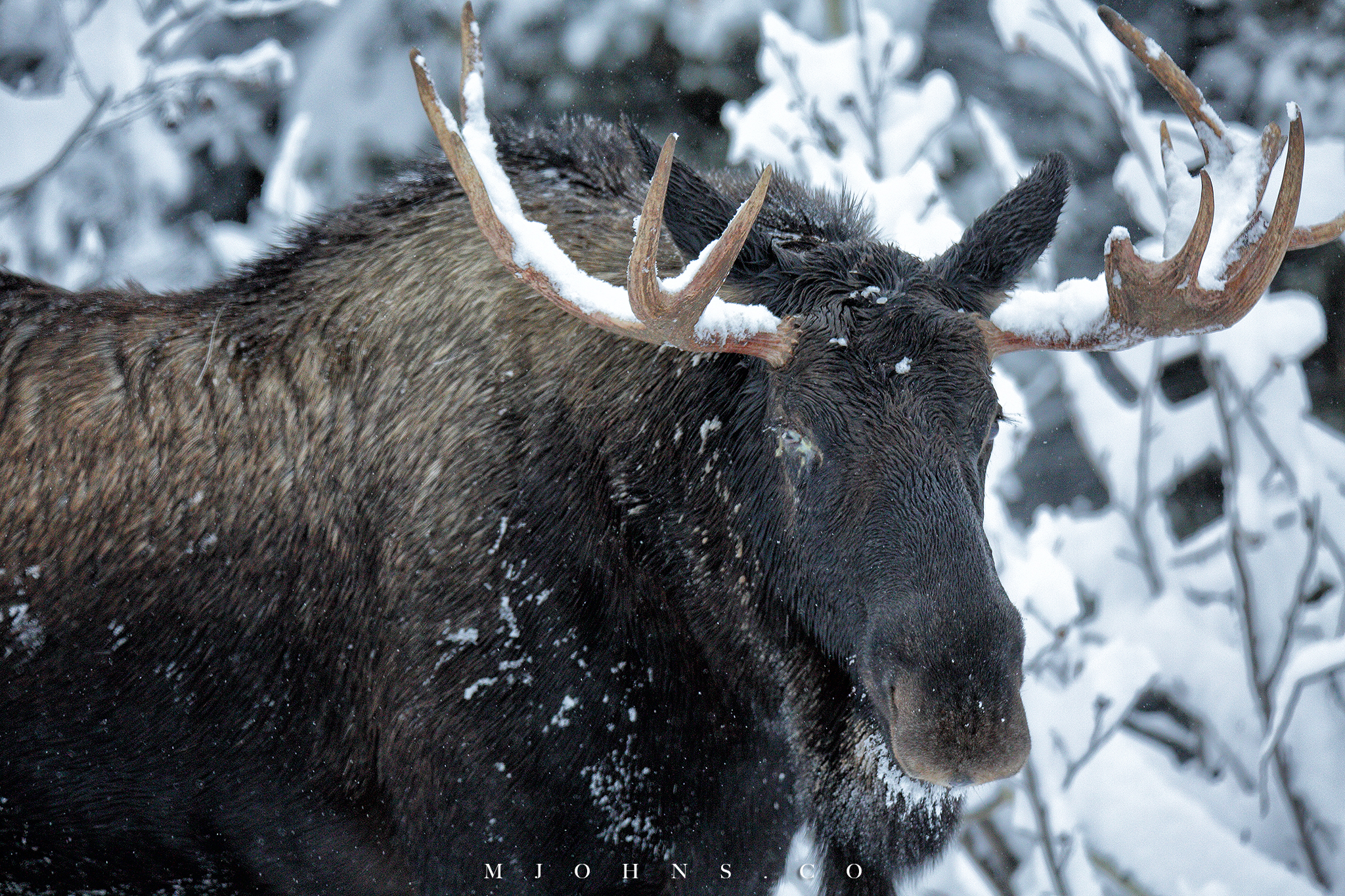 ▲風雪交加之時看到路邊有一頭麋鹿巍然聳立,我們在路邊停下跟他對視了好一會兒。