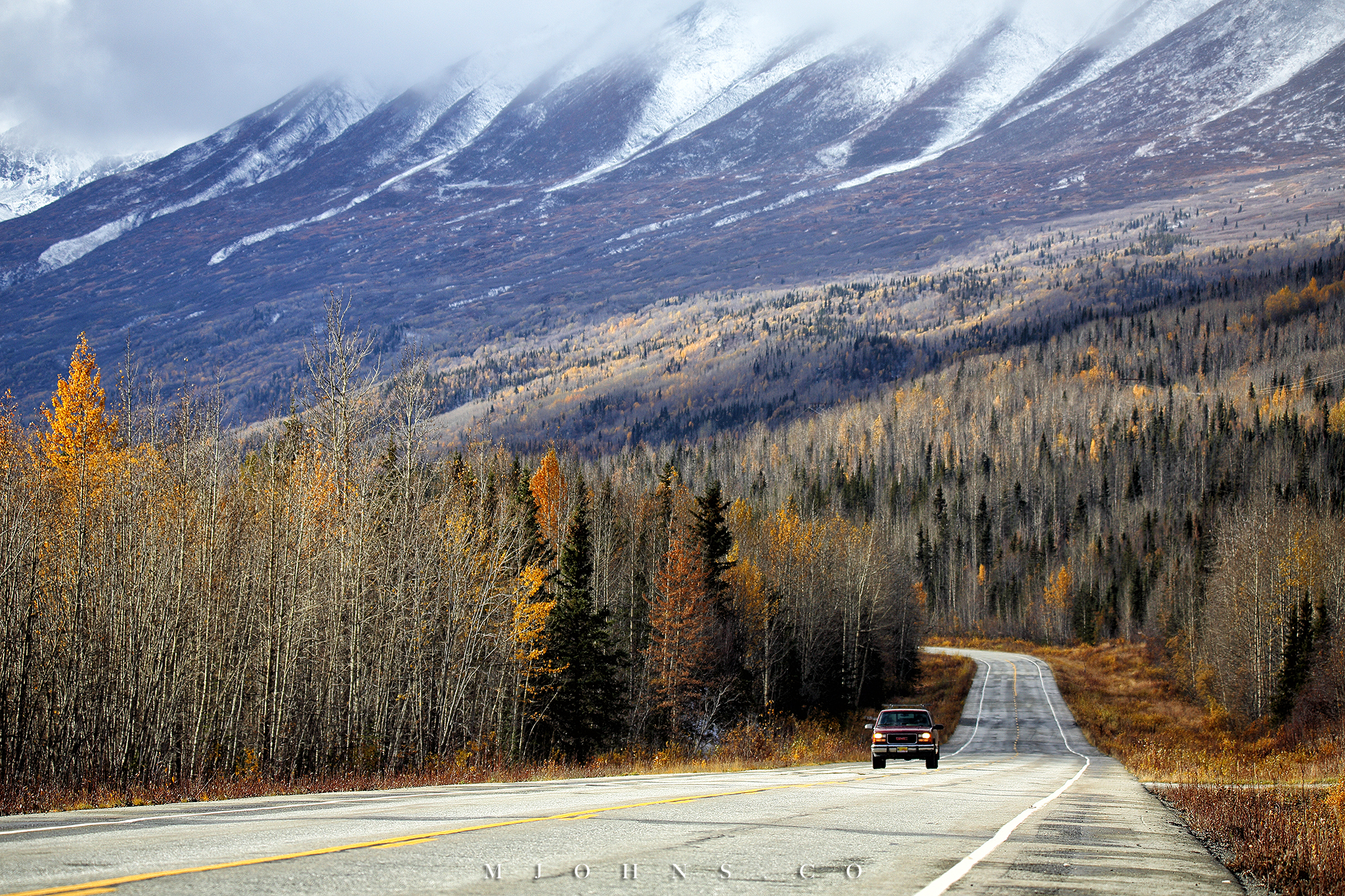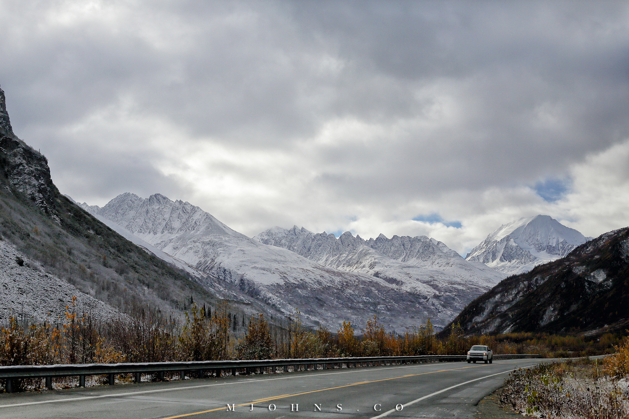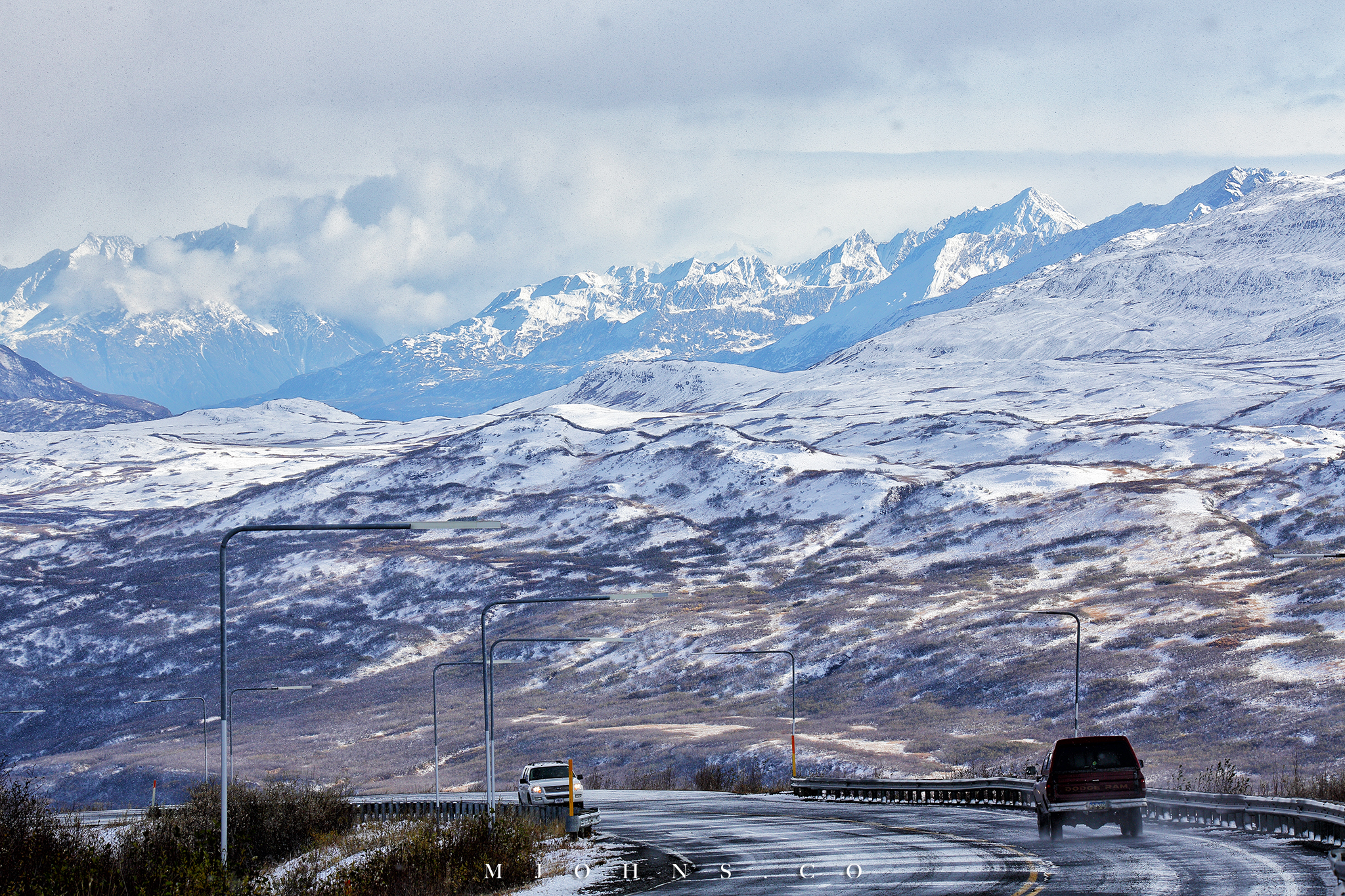 之後進入了公路旅行的階段,兩年前我已經繞過阿拉斯加的小圈公路,加上這次公路行天數排得不長,所以主要針對Richardson Highway從Fairbanks往返Valdez。我們剛好在風雪減弱後出發,但是一路上的路況仍是非常差,只能降低速度小心翼翼行駛,才平安渡過第一段南下。