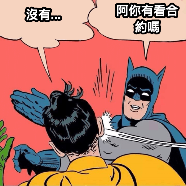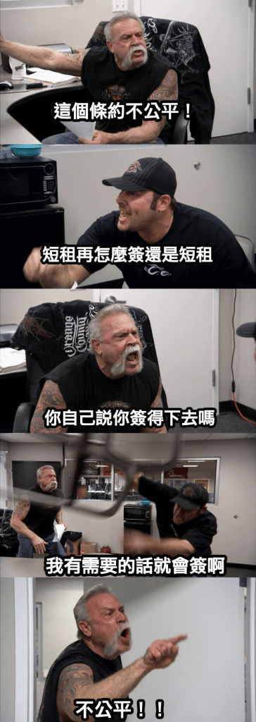 「我的認知裡不應該出現這種條約」,我就問說你是沒看過合約嗎,他啞口無言。我的租約只有三、五頁(還是中文的),別人的十幾頁都有,那明明合約擬好好幾個月了自己不看,簽完了有問題了才開始反應,然後說我不先跟他講。每個人都有自己的事情要忙,看合約本來就是要簽的人自己的責任,還能理直氣壯的罵我。如果去餐廳吃飯自己不看價目表開始按照自己喜好點菜,可以吃完覺得太貴跟老闆說不付錢嗎?
