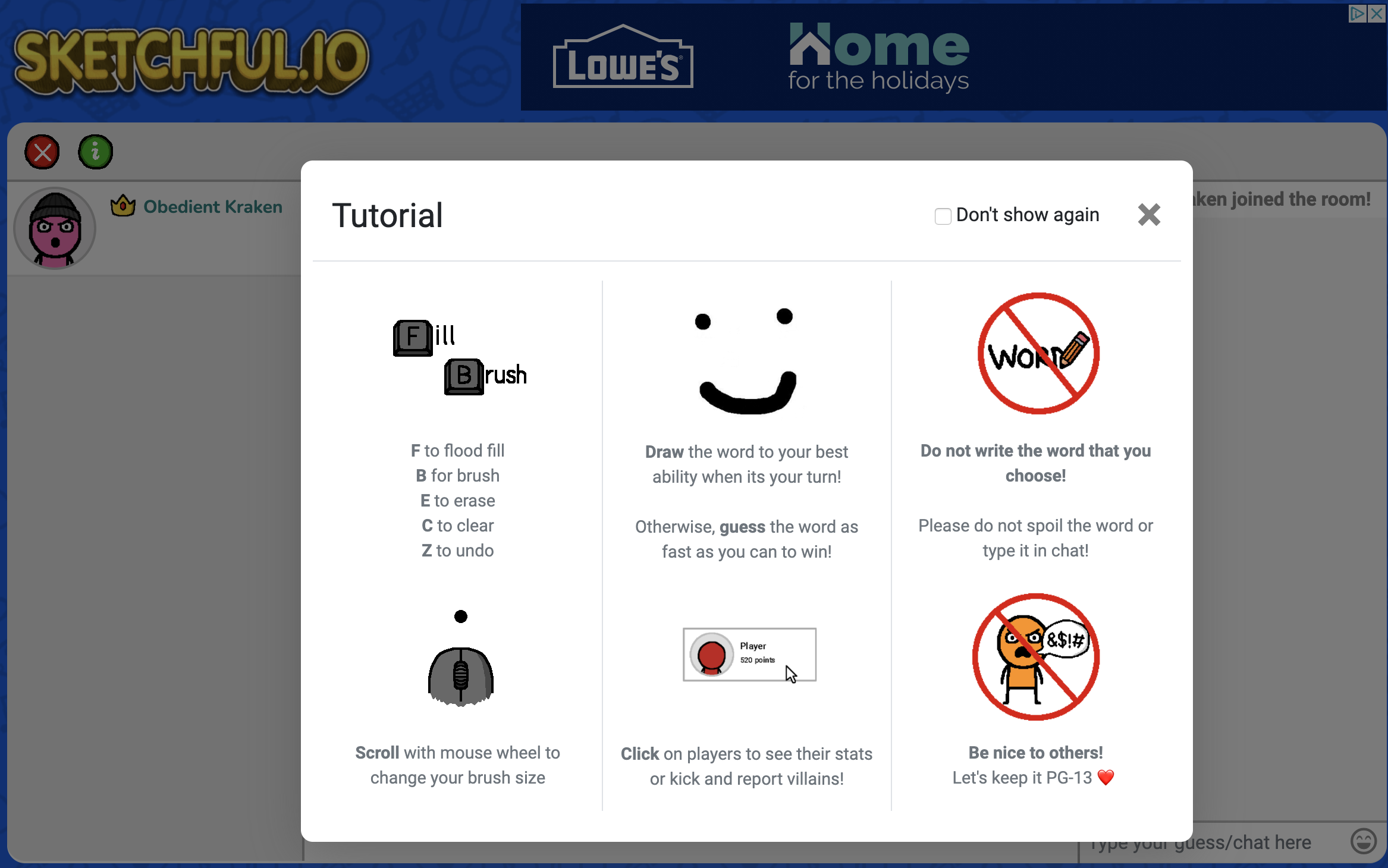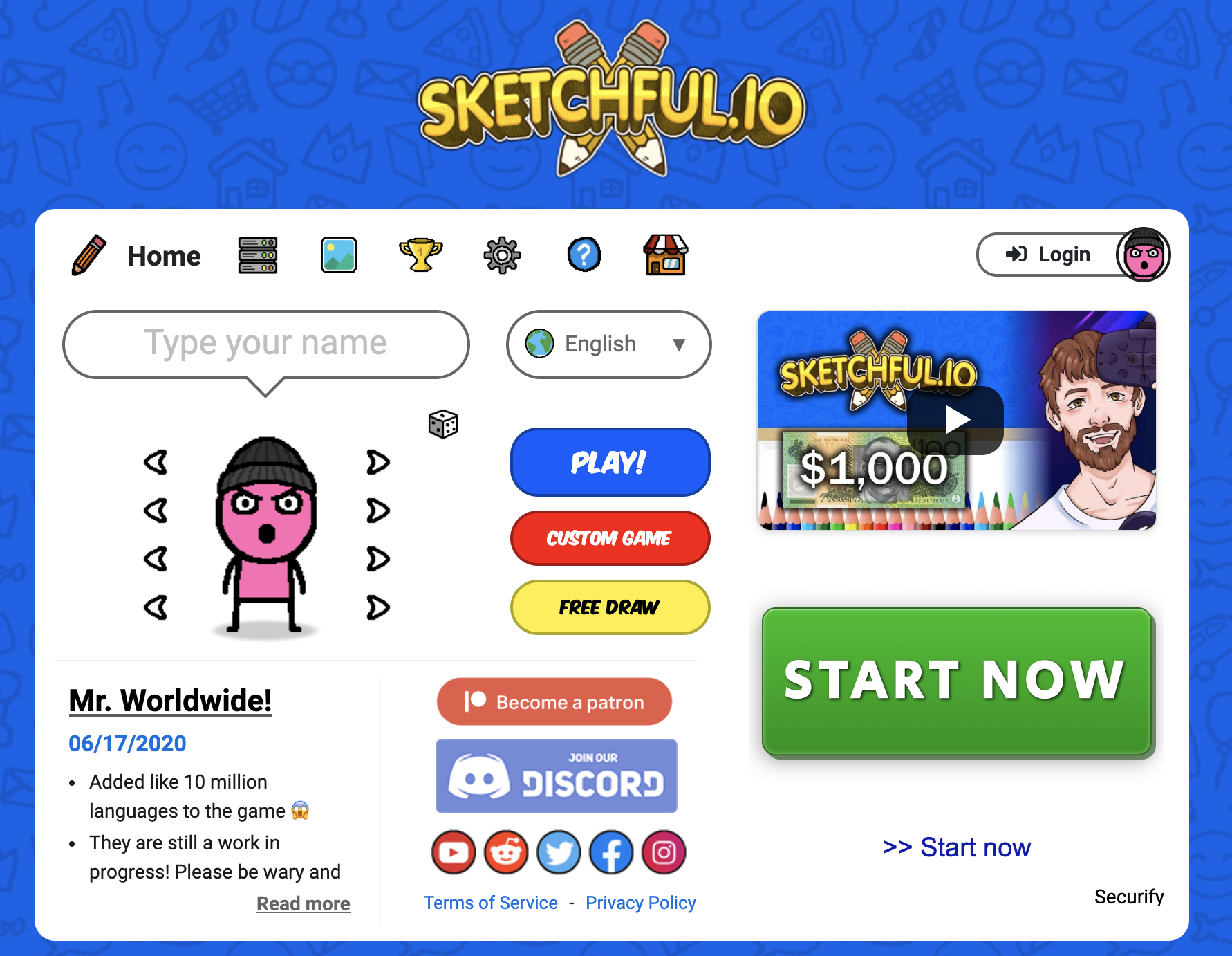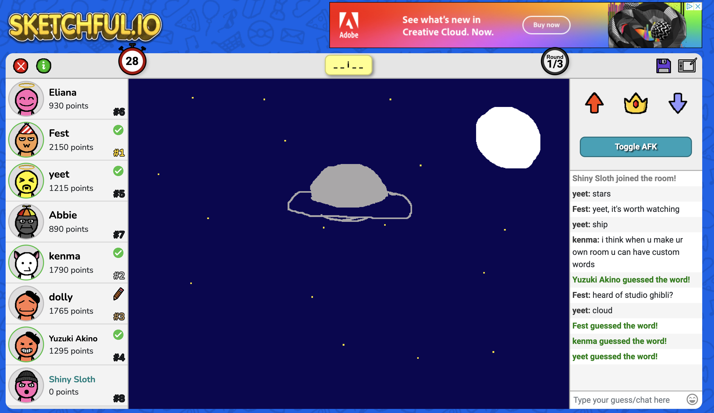 經典的Draw and guessing/ Pictionary game,大家輪流選一個主題畫畫,越快猜到分數越高。網路上很多版本,這個版本介面簡潔、上手容易、互動性高,主持人只要簡單說明規則大家就可以開始。