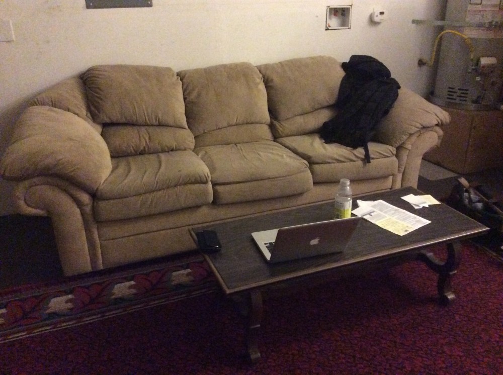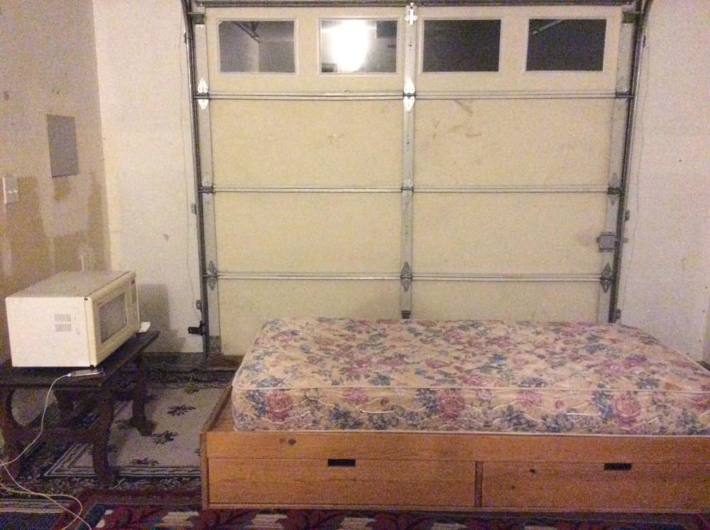 我打開車庫的門,裡面有一個衣櫃、一張三人沙發、兩張矮桌、一張單人床還有一個熱水器。看得出來應該曾經是作為所謂男人的洞穴(Men’s cave)。而車庫構造自然是四面牆壁沒有窗戶,車庫門上有幾塊半透明的玻璃勉勉強強有些光透出。而這一個空間包水電網五百美金。我問黑人哥說住在這邊跟熱水器一起會不會出事啊,他跟我說沒事沒事都有裝一氧化碳偵測器。